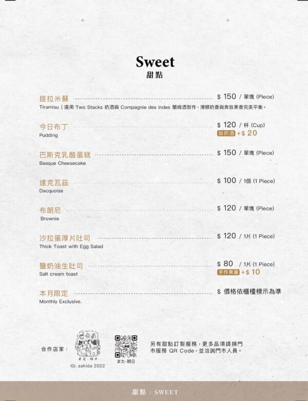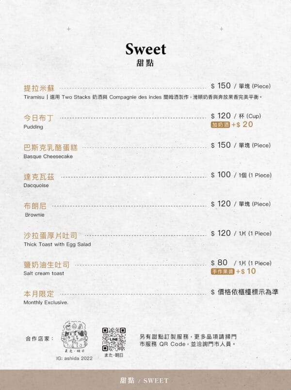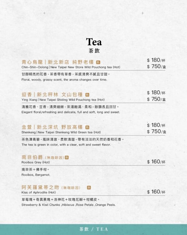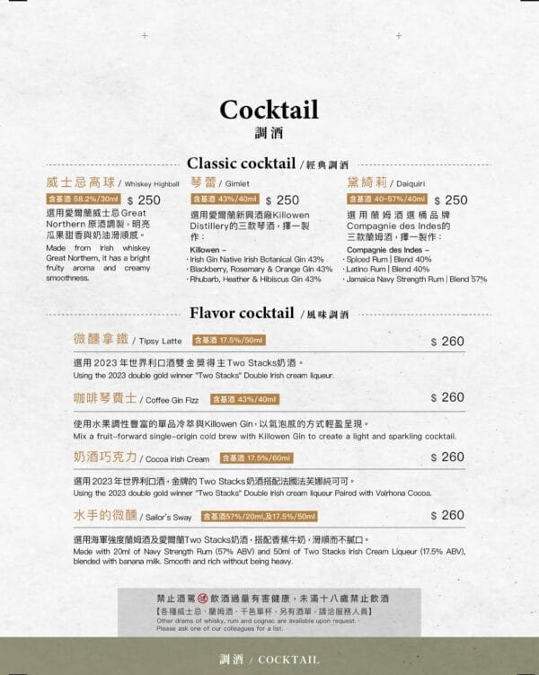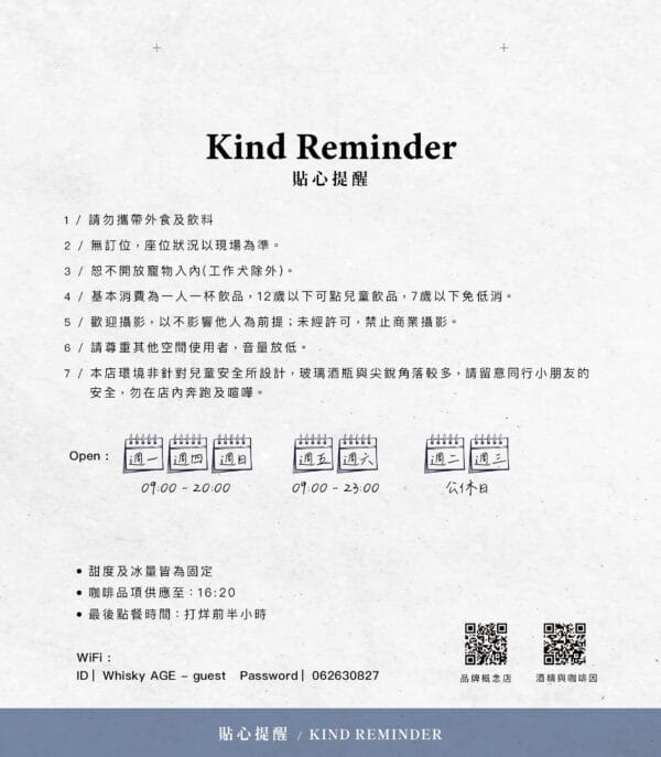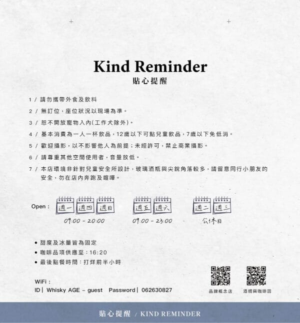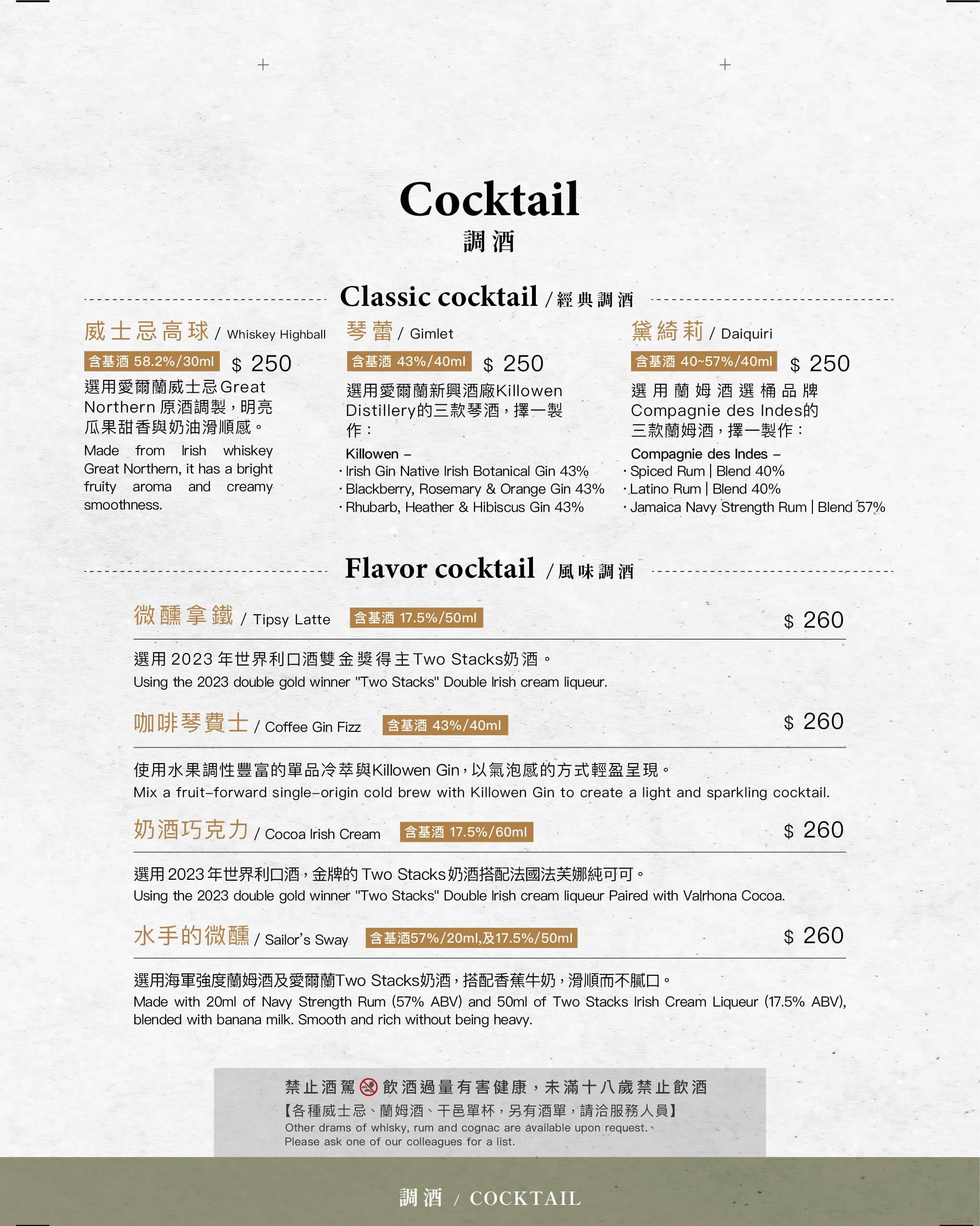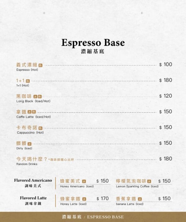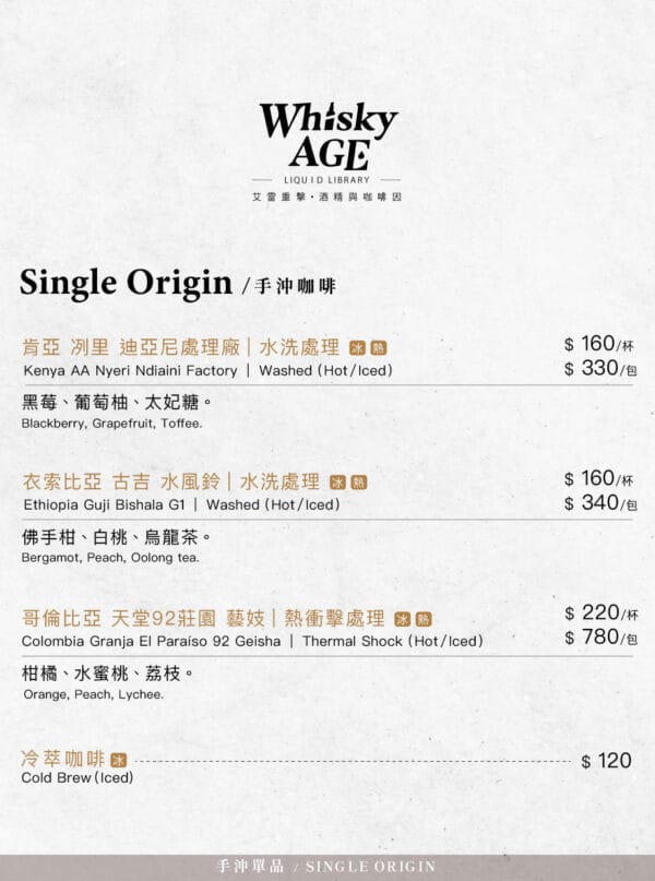 《艾雷重擊・酒精與咖啡因》・ 數百款單杯付費品飲酒單可供選擇・ 提供各式咖啡、茶(有/無 咖啡因)、氣泡飲、調酒、甜點……營業時間週一、四、日 09:00 – 20:00(L.O. 19:30)週五、週六 09:00 – 23:00(L.O. 22:30)濃縮咖啡為基底的飲品、手沖咖啡,供應時間 – 16:20休週二週三詳細資訊請以 Instagram 或 Facebook 公告為主《艾雷重擊・酒精與咖啡因》・ 提供數百款單杯付費品飲・ 供應各式咖啡、茶(有/無 咖啡因)、氣泡飲、調酒、甜點……營業時間週一、四、日 09:00 – 20:00(L.O. 19:30)週五、週六 09:00 – 23:00(L.O. 22:30)濃縮咖啡為基底的飲品、手沖咖啡,供應時間 – 16:20休週二週三詳細資訊請以 Instagram 或 Facebook 公告為主 白天菜單 Day Menu 晚上菜單 Night Menu 手沖豆單 Hand-Drip Coffee Menu