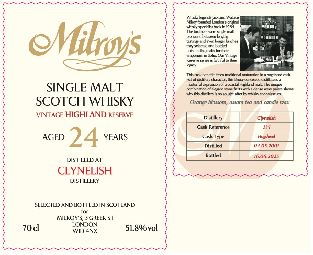 Milroy’s of Soho, Clynelish, 2001, 2025, 24yo, Hogshead, 51.8%