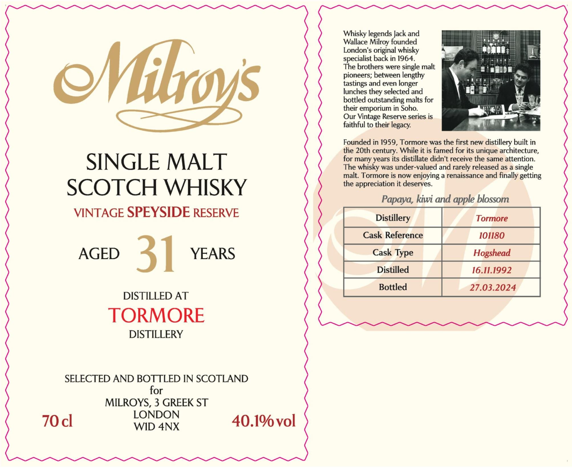 Milroy’s of Soho Tormore 1992/11/16 31yo Hogshead 40.1%