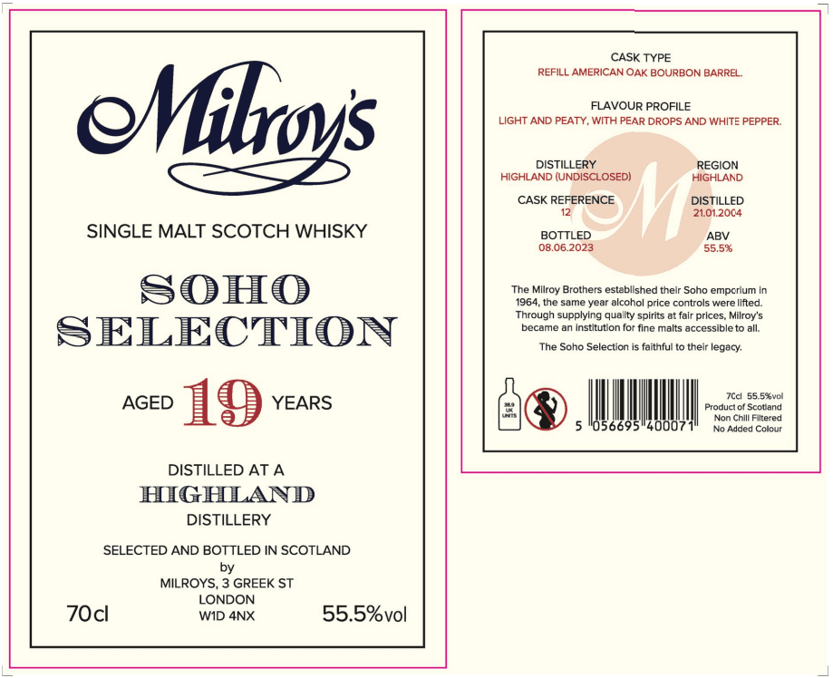 Milroy’s of Soho MOS001, “Soho Selection”,A Highland Distillery, 2004, 19yo, Refill American Oak Bourbon Barrel, 55.5%