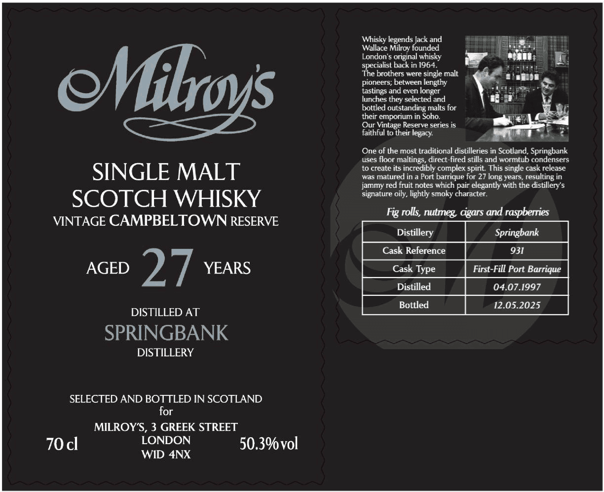 Milroy’s of Soho, Springbank, 1997/07/04, 2025/05/12, 27yo, First-Fill Port Barrique, 50.3%